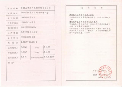 2014年3月我司正式獲得安徽省住房與城鄉(xiāng)建設(shè)廳頒發(fā)的幕墻工程設(shè)計(jì)與施工、建筑裝飾工程設(shè)計(jì)與施工貳級(jí)證書,標(biāo)志著公司的施工水平已上一個(gè)新臺(tái)階,公司的承攬業(yè)務(wù)范圍進(jìn)一步擴(kuò)大。這是對(duì)公司近年發(fā)展的肯定,也為公司2014年進(jìn)一步擴(kuò)大市場(chǎng)占有率提供重要的基礎(chǔ)。