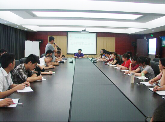 7月4日下午14:30,集團公司上半年各項工作總結會議在公司五樓會議室召開,此次半年度總結會議由集團公司董事長孔德云先生主持,常務副總朱曉莉女士攜全體行管員工參加。 會議第一個議程首先由人力資源與行政管理部安排2014年近期新入職員工進行自我介紹,之后孔總要求各部門經理帶領下屬員工集體給所有員工做介紹,大家彼此之間相互認識,現場氣氛頓時活躍起來,這種相互介紹熟悉,不僅使新加入集團公司的員工感受融入大家庭一份子的溫暖,同時也拉近了員工之間的感情。