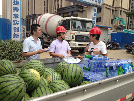 2015年8月6日,公司人力資源與行政管理部專員及質(zhì)量安全部經(jīng)理丁益民組成高溫慰問組,代表集團(tuán)公司開展對夏季各項(xiàng)目施工隊(duì)“送清涼”活動,對冒著酷暑高溫持續(xù)施工的一線人員表示慰問與感謝。