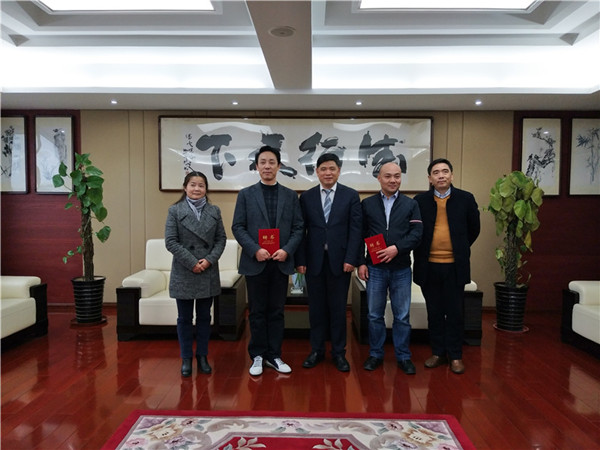 (左起:常務副總朱曉莉、駐京辦主任趙勤玉、董事長孔德云、駐京辦執行主任王永勝、集團副總孔德雨)