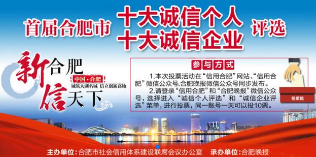 12月7日至12與13日,由合肥市社會(huì)信用體系建設(shè)聯(lián)席會(huì)議辦公室主辦,合肥晚報(bào)承辦的合肥市首屆“十大誠(chéng)信企業(yè)”、“十大誠(chéng)信個(gè)人”網(wǎng)絡(luò)評(píng)選活動(dòng)圓滿結(jié)束,我司孔德云董事長(zhǎng)參選到“十大誠(chéng)信個(gè)人”投票中。
