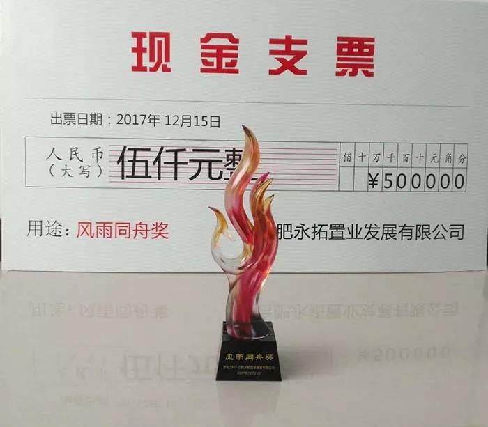 1215日,由合肥合肥永拓置業發展有限公司組織的“都會1907項目”慶祝大會順利舉行。慶祝會上,我司門窗承建工程被授予“風雨同舟”獎并獲得5000元獎金,這是對我司為質量、為服務合作奮斗的褒獎。