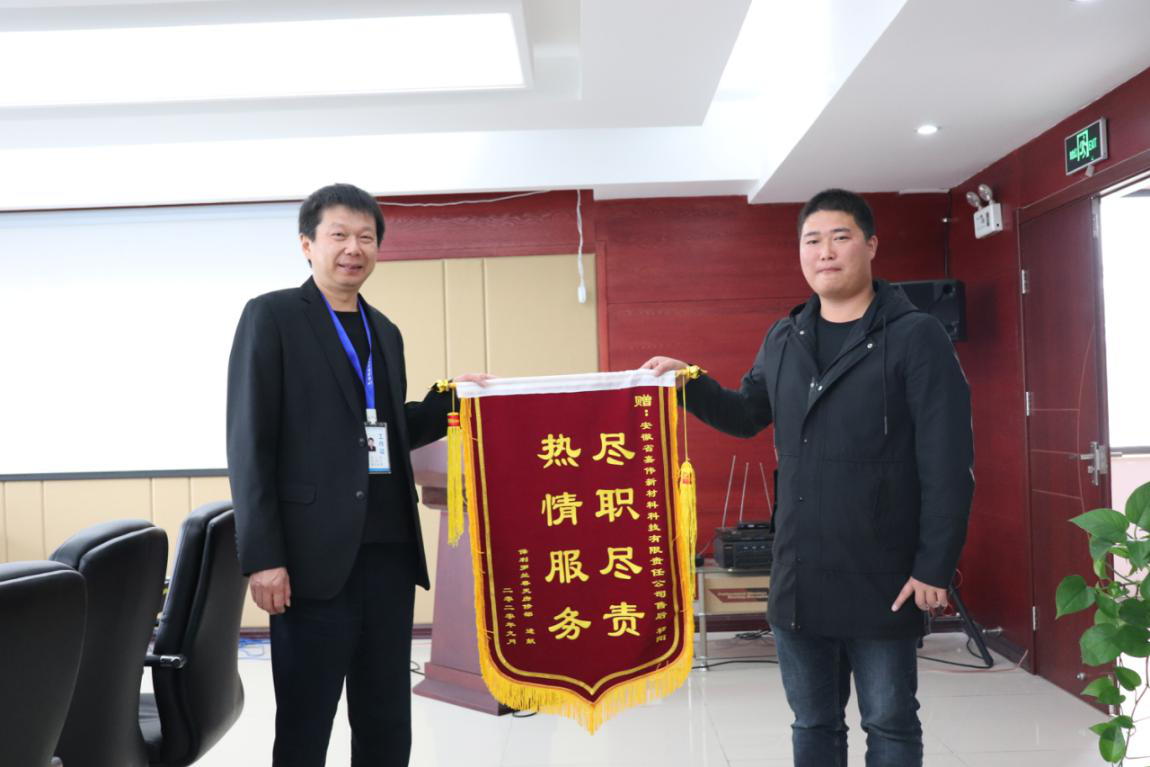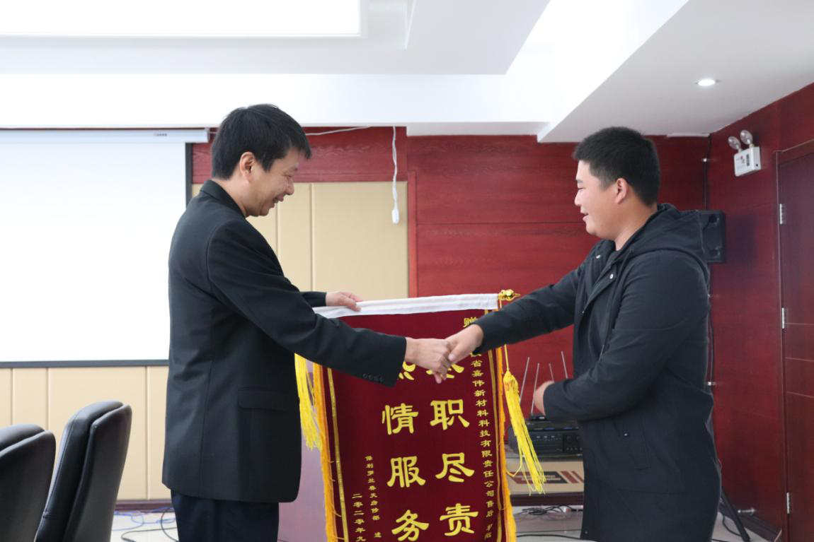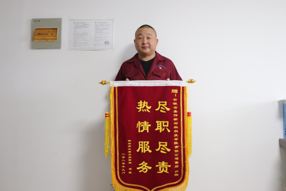 115日,安徽嘉偉新材料科技有限責任公司售后部主管楊陽收到保利羅蘭春天房修部主管李信送來的錦旗——“盡職盡責/熱情服務”,公司常務副總經理許平給予了熱情接待。